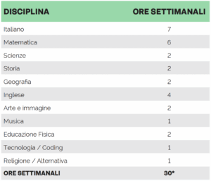 L’esposizione alla lingua inglese raggiunge 13 ore settimanali (43% delle lezioni settimanali).